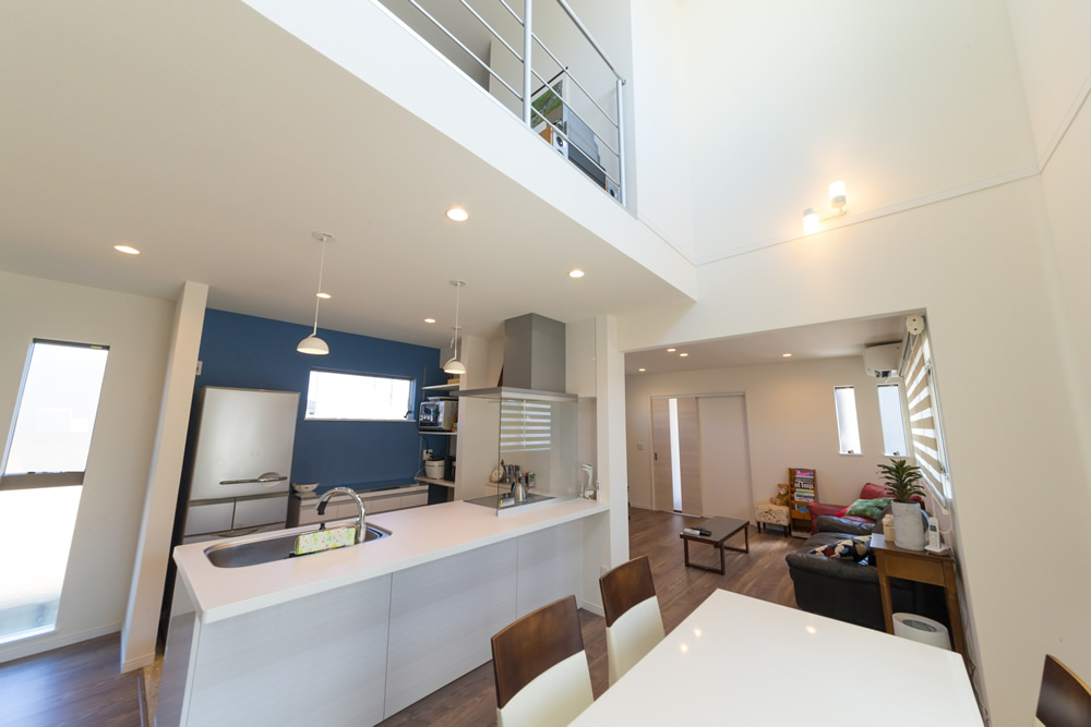 陽光が差し込んで明るい、大きな吹き抜けのダイニングは開放感たっぷり。